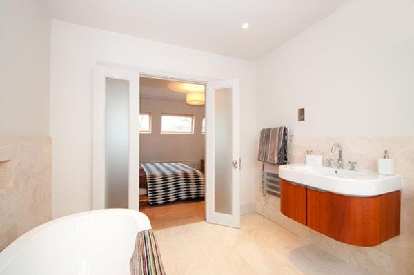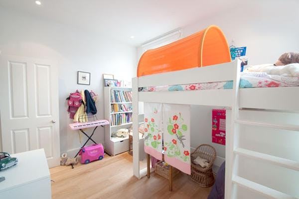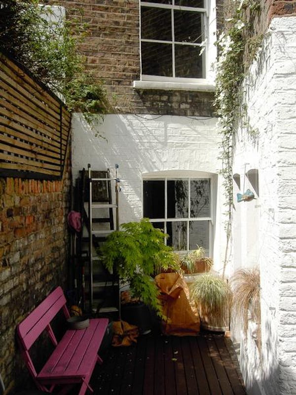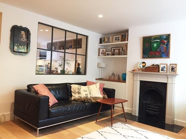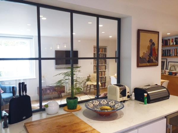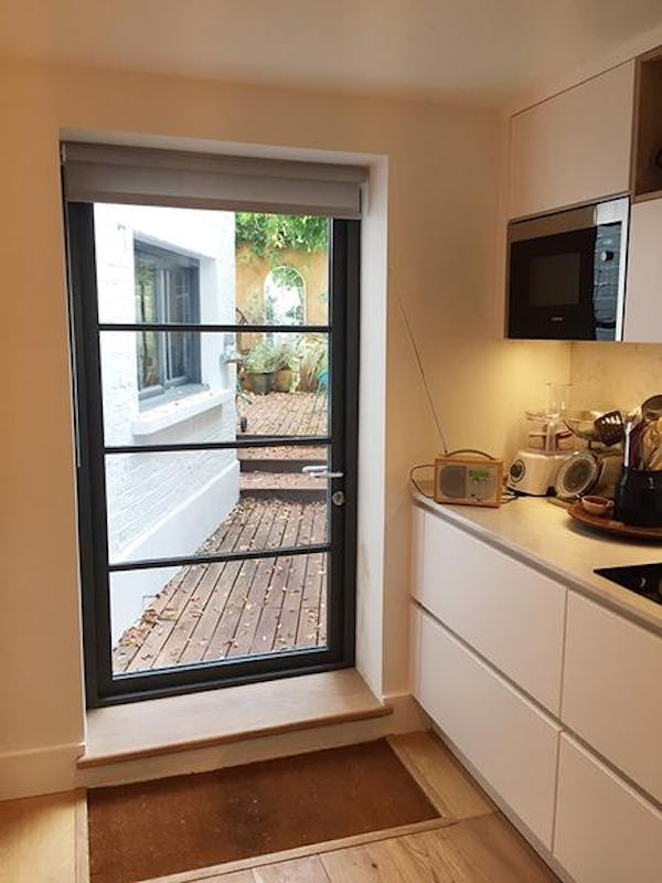 A four floor corner terraced house with open plan kitchen/dining room in the basement level.