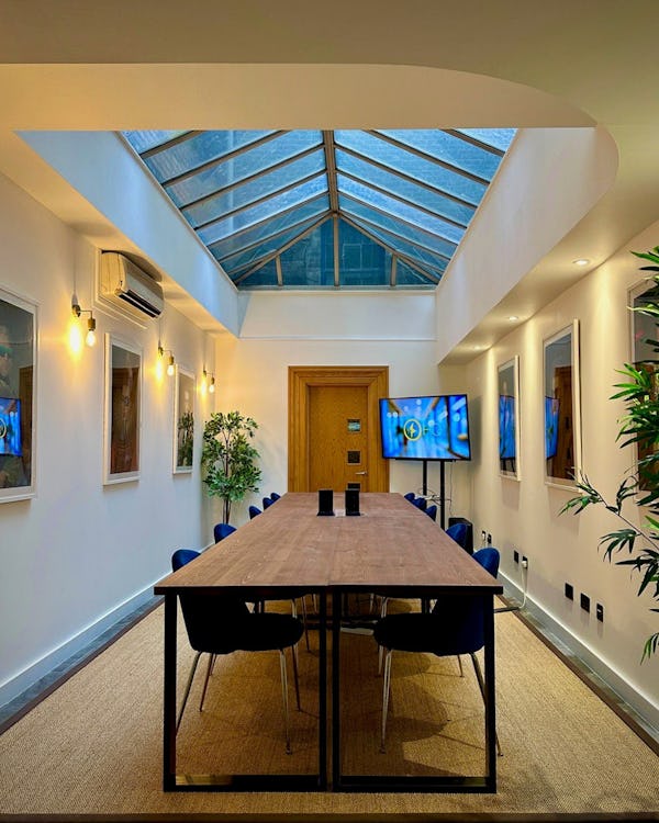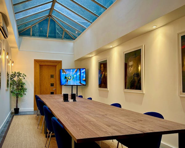 The demure Boardroom seats 8 and features double-aspect windows. The airy Apartment accommodates up to 8 and includes a private kitchen and soft area. The glass-roofed Conservatory seats 14 and comes with a kitchenette, bathroom, and phone booth. All spaces benefit from abundant natural light, air conditioning, fast Wi-Fi, complimentary filtered water, and tea and coffee. Additional filming and production equipment is available on request.