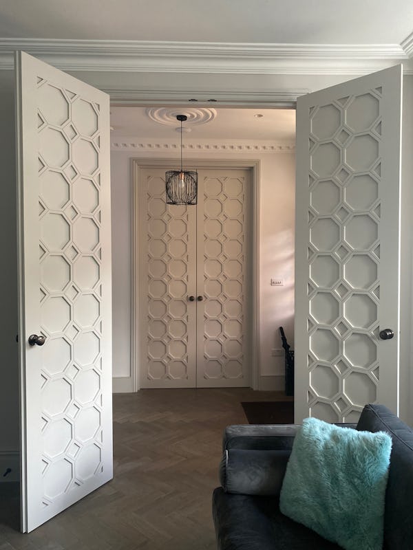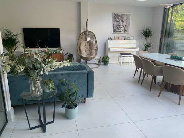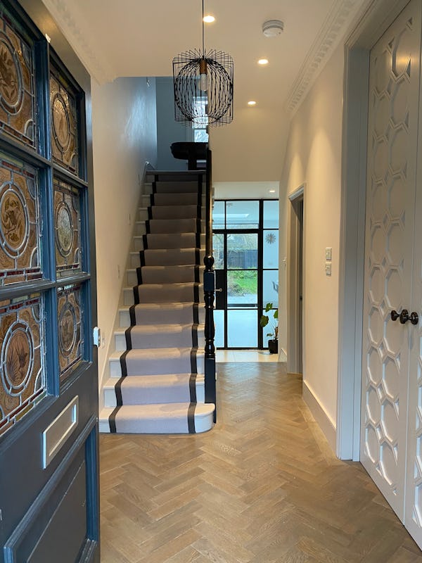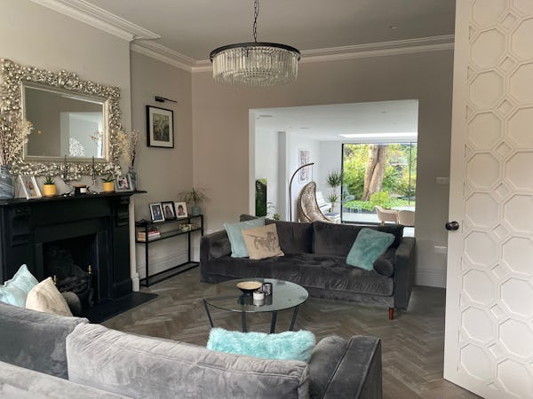 The wide entrance hall features herringbone parquet flooring and tall panelled doors leading to a snug on one side and a sitting room on the other. The snug is the smaller of the two rooms and is completely separate from the rest of the ground-floor living spaces. The sitting room includes a black slate fireplace and flows into the family room and kitchen–diner, which occupies the rear of the house.