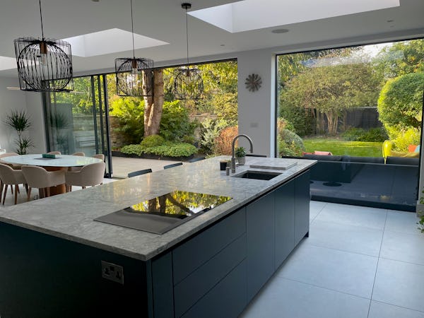 At the end of the hall are the boot room, laundry room, and w.c., along with crittall-style doors that open into the kitchen, dining, and family room. Wide sliding doors lead out to the terrace and the mature garden beyond. The kitchen is contemporary in style, featuring a marble countertop and an induction hob set within the island.