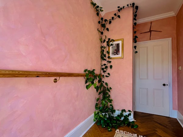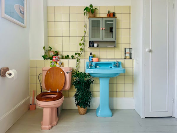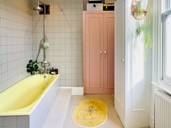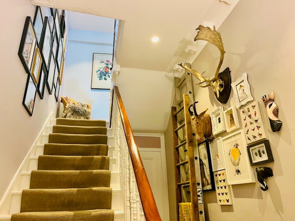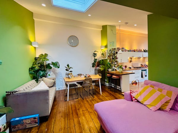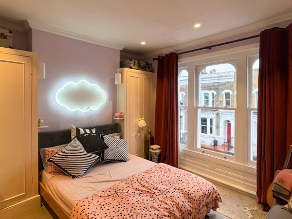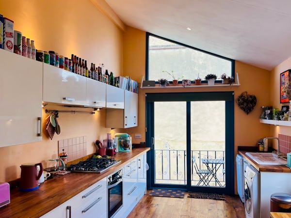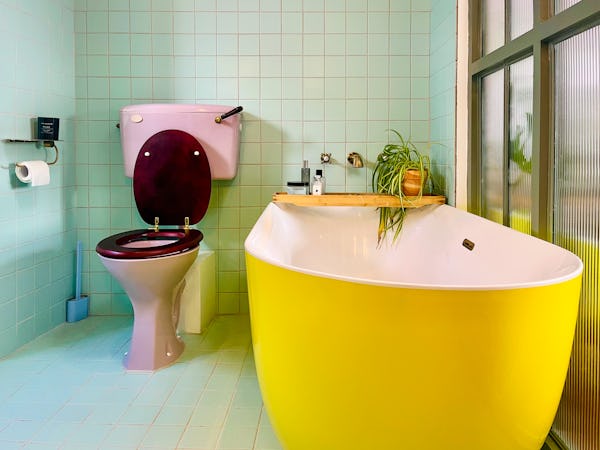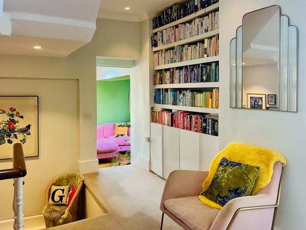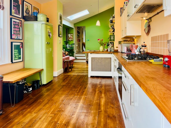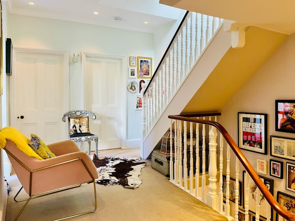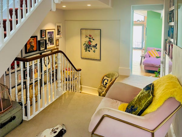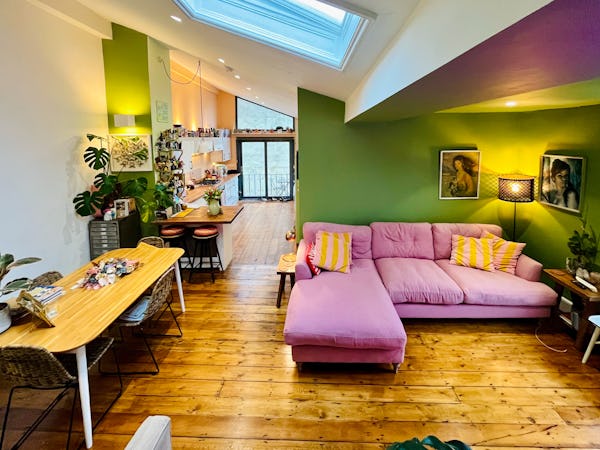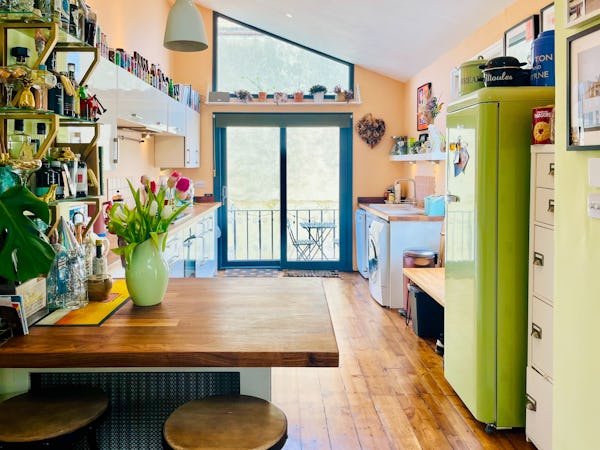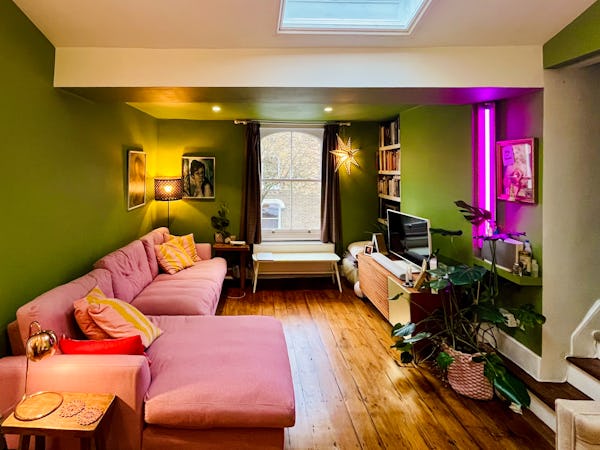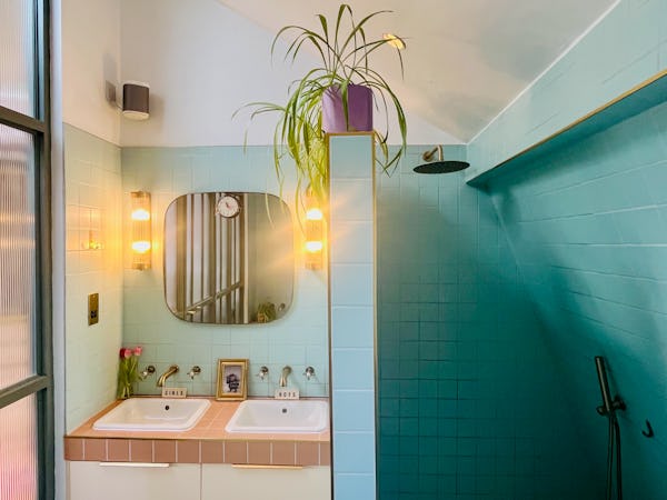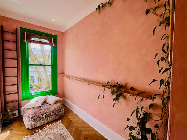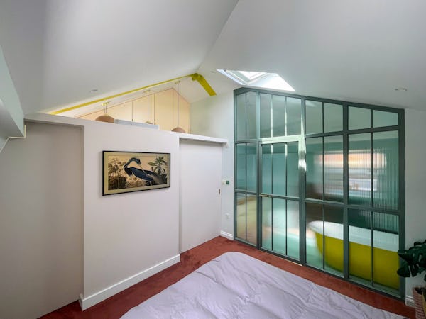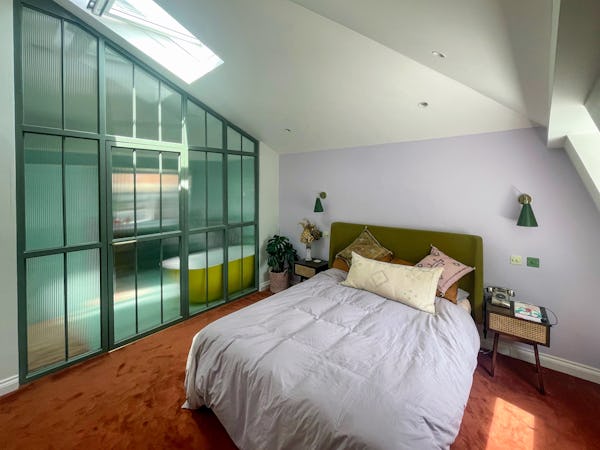 This corner house is a standout shoot location, centered around an expansive first-floor living space with vaulted ceilings and wooden floors that give the room an unusual sense of scale for the area. The interior offers a mix of distinct textures and eras, from the serene, lime-washed yoga studio and modern loft suite with reeded glass to a characterful 1960s bathroom featuring a mis-matching pastel-colored suite. Large windows throughout ensure plenty of natural light for the first-floor bedrooms.