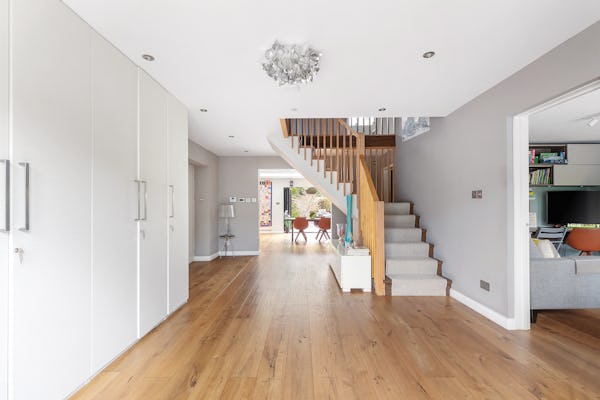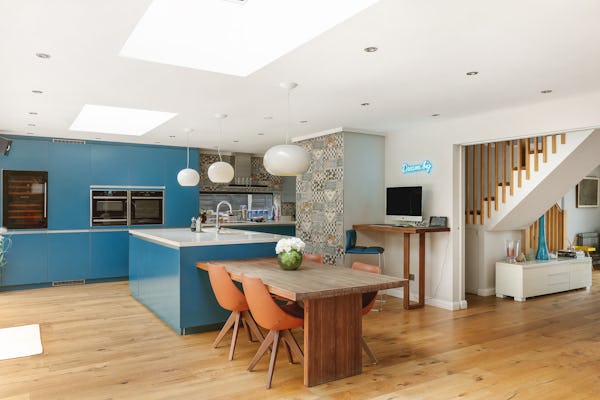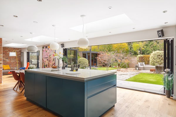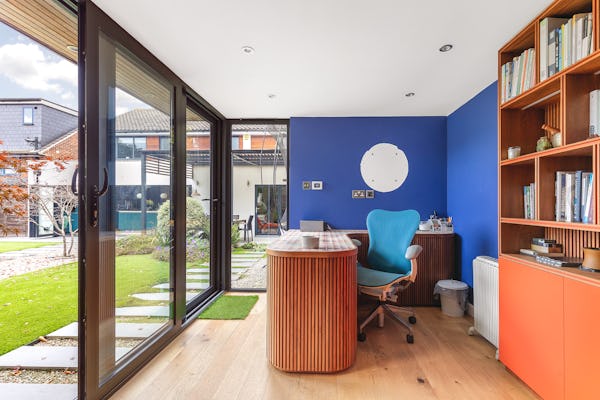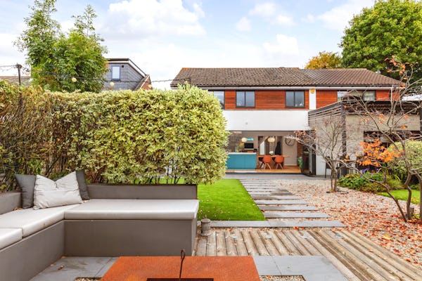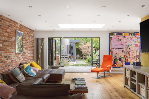 Crystal Palace detached new-build home. Interiors are open-plan, contemporary and colourful. Includes spacious garden with terrace, fire pit and summer house office.