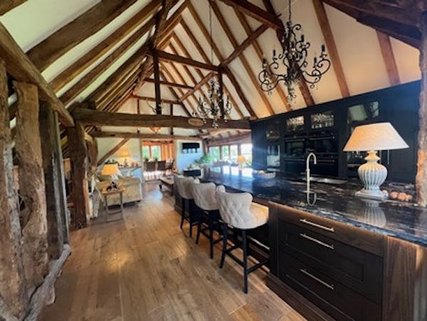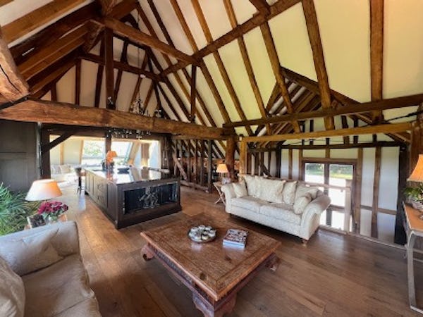 Barn conversion home with original elements dating 300+ years back. The five bed family home sits within six acres of land and fields. A remote area, with space for cars, lorries, etc, whilst only a couple of miles from Oxted town.