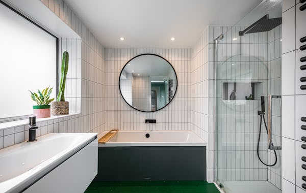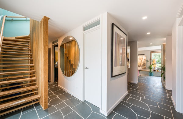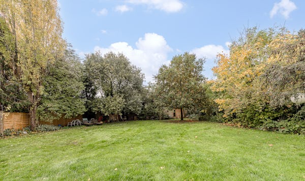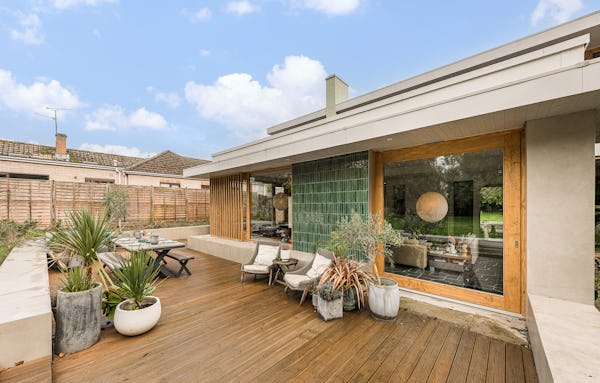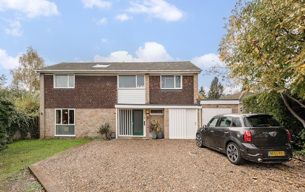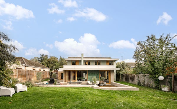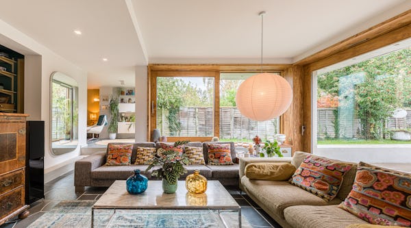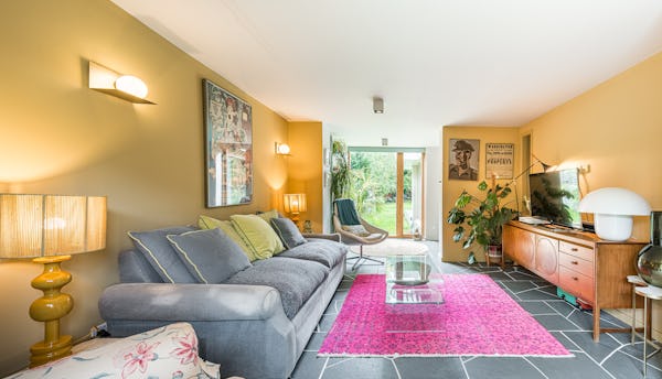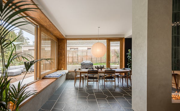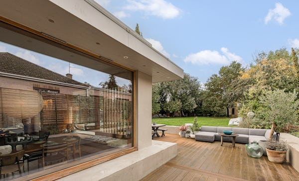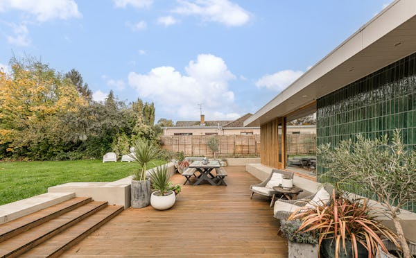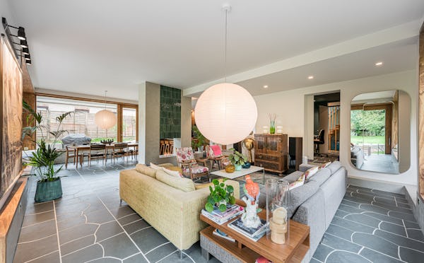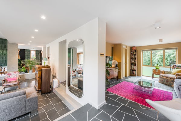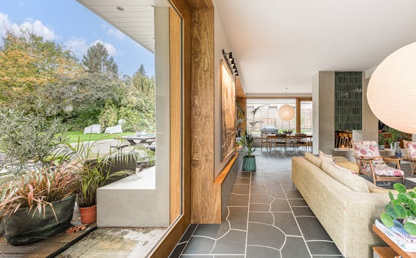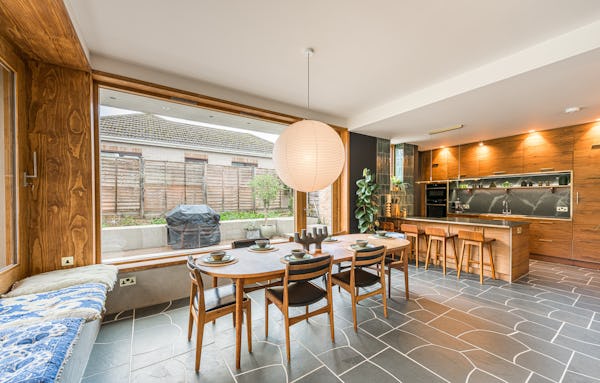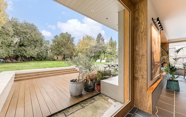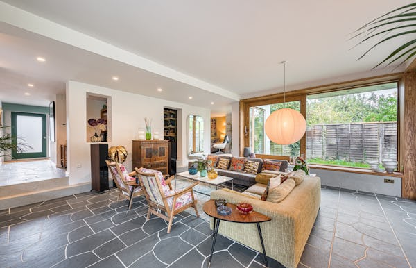An architect-designed home with Mid-Century Modern styling, generous proportions and abundant natural light throughout. High ceilings and open-plan living create a strong sense of space, while the use of natural materials adds texture and warmth on camera. The main living area is a large, open-plan kitchen, dining and living space, featuring hand-cut slate crazy paving and distinctive wood-slatted windows. Additional interiors include a separate TV room, study, four bedrooms and a principal suite with walk-in dressing room. Outside, a spacious garden with a wooden terrace and outdoor dining area provides further versatile options for filming and stills.