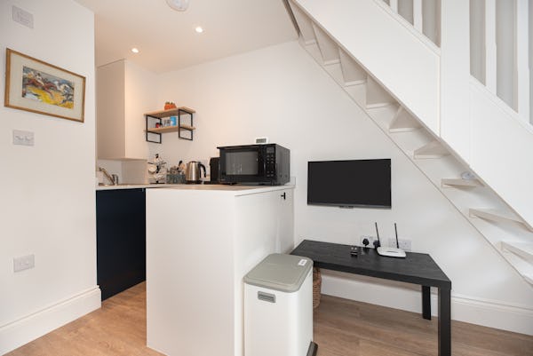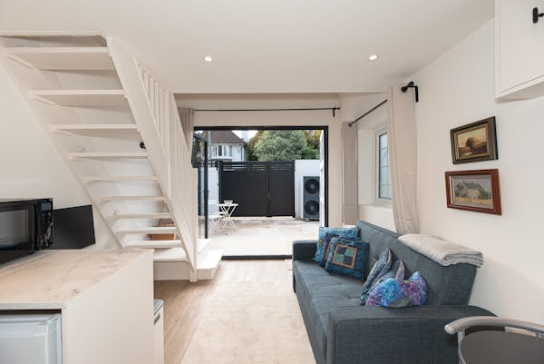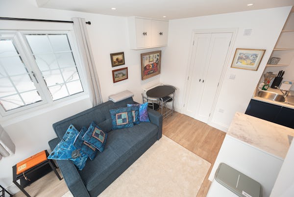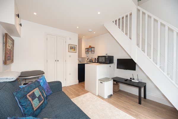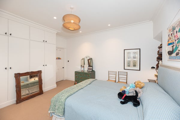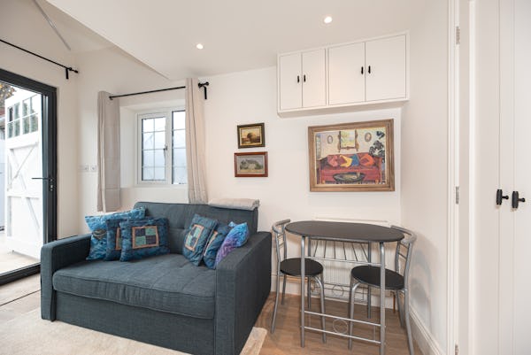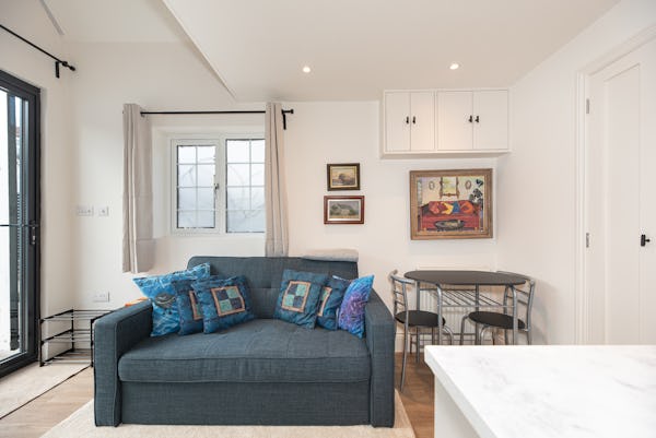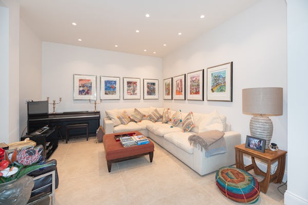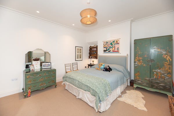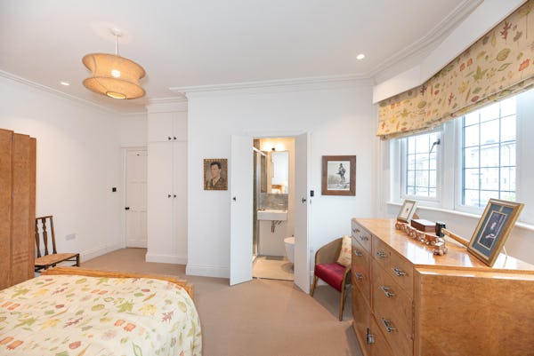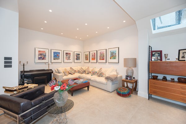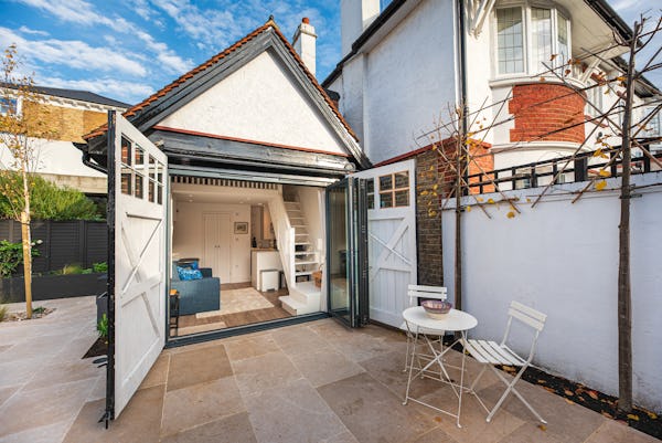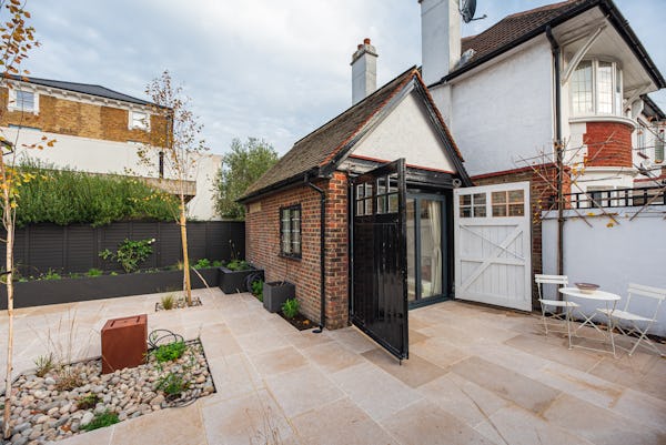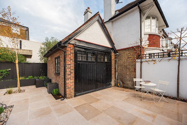 The heart of the home is designed for light and scale, with large sliding doors opening onto a private patio garden. Uniquely, the property includes a converted period garage now serving as a self-contained studio flat—perfect for a dedicated green room, production office, or high-end talent space. With a rare side-street car gate providing direct access to both the front and rear.