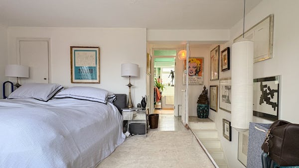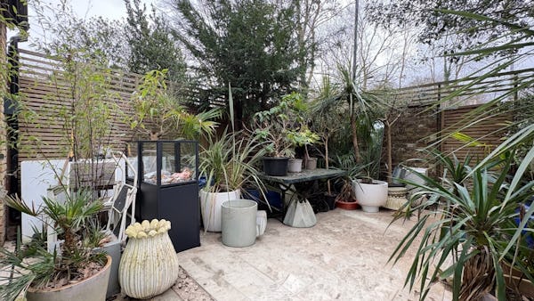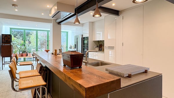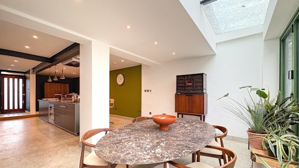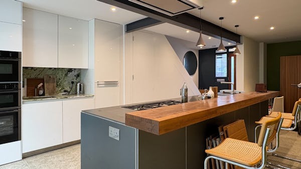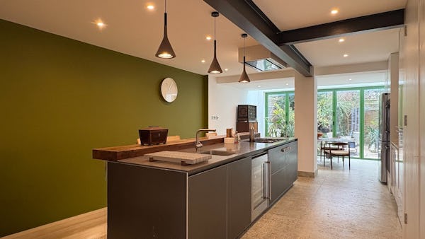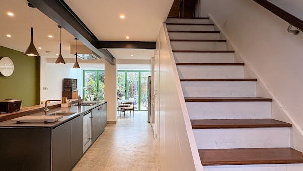 The property is centred around a 15-metre high-spec kitchen leading to a garden, creating a natural flow between indoor and outdoor spaces. Upstairs includes one large bedroom and a smaller second bedroom, with a bathroom on the top floor and an additional ground floor WC.