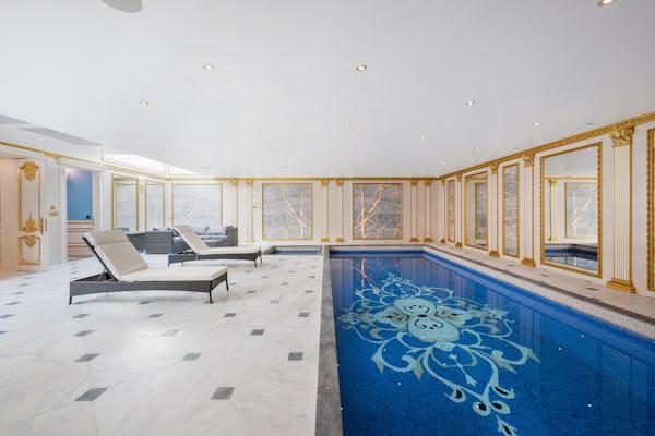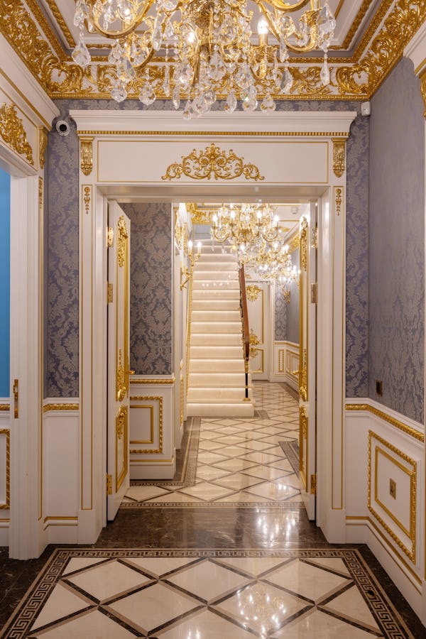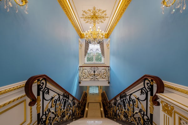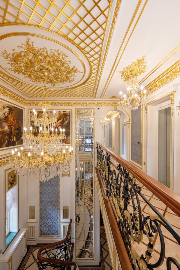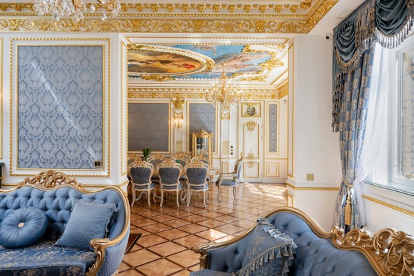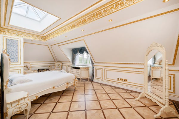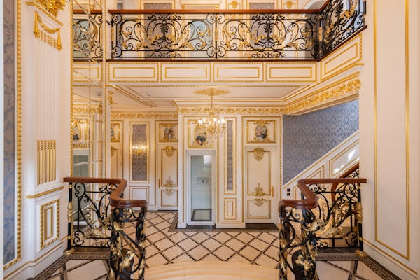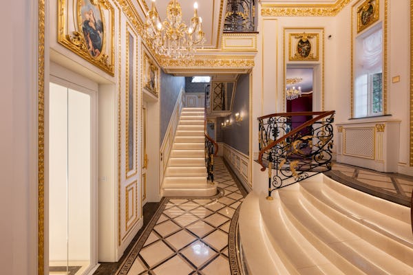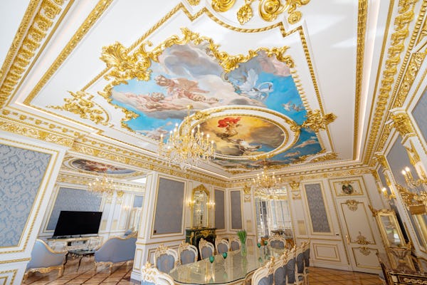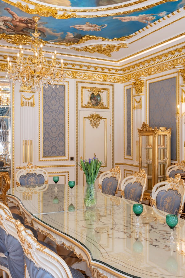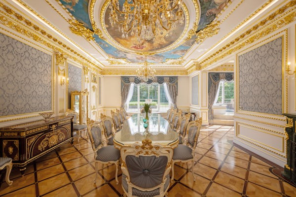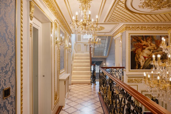 The property features luxurious classical interiors, ornate gold mouldings, marble surfaces, crystal chandeliers, high ceilings with hand-painted frescoes, and custom furniture throughout.