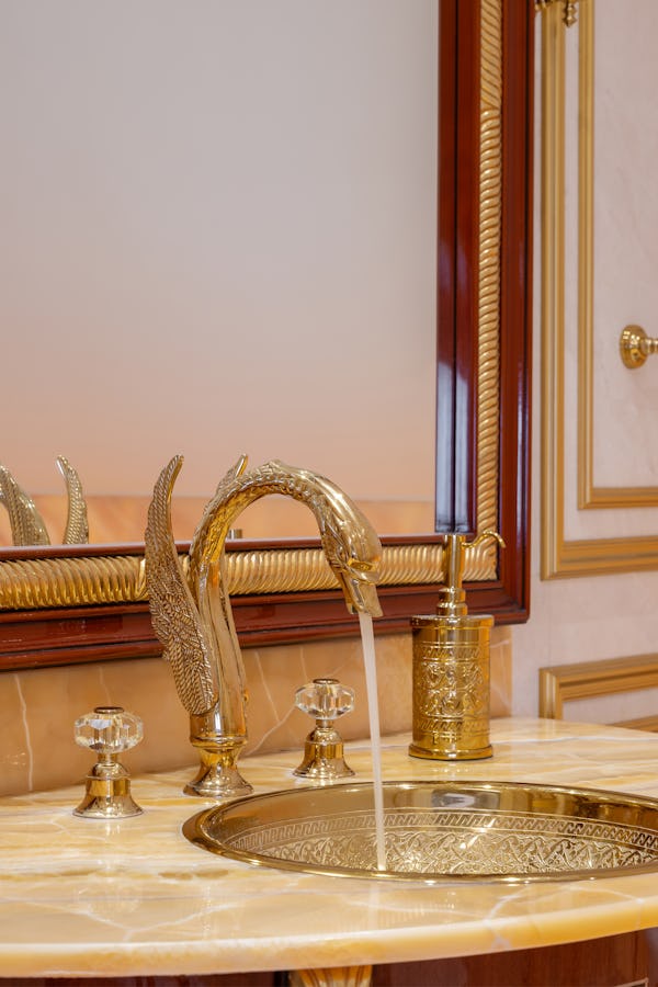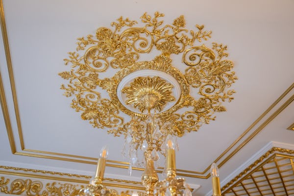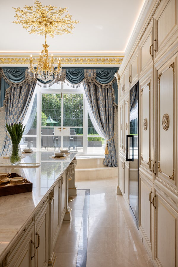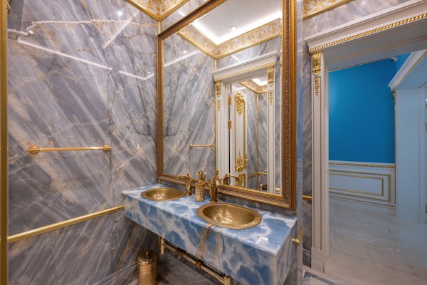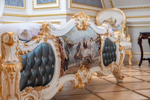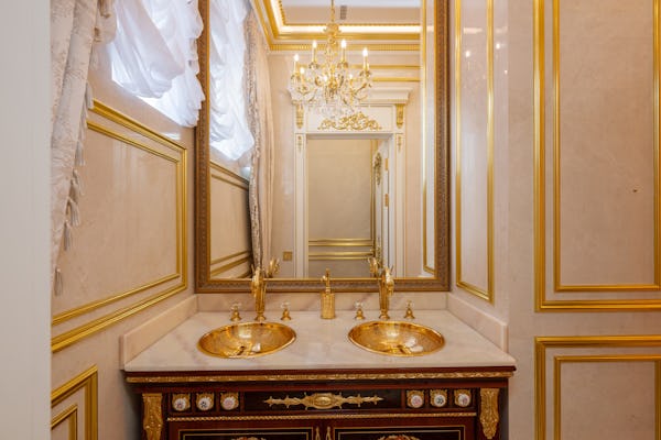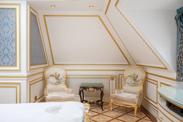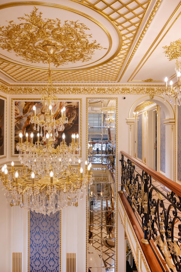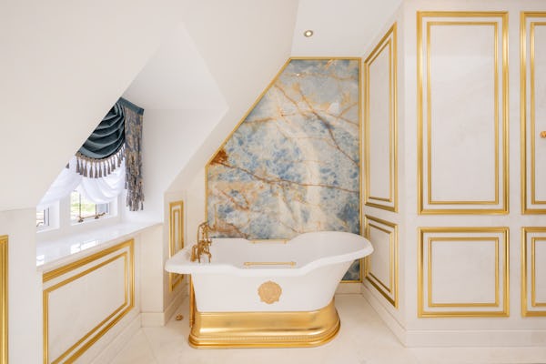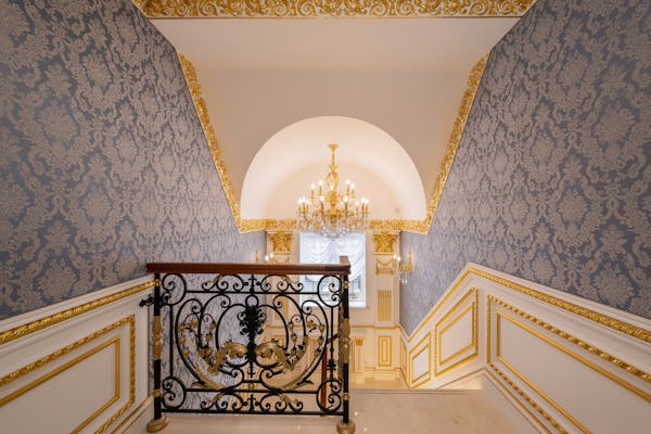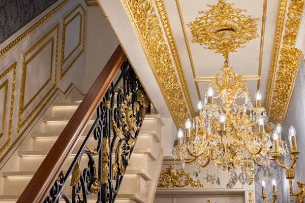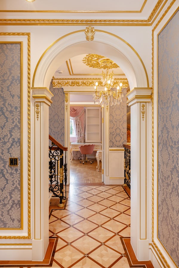 The property features luxurious classical interiors, ornate gold mouldings, marble surfaces, crystal chandeliers, high ceilings with hand-painted frescoes, and custom furniture throughout.