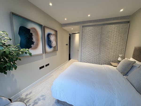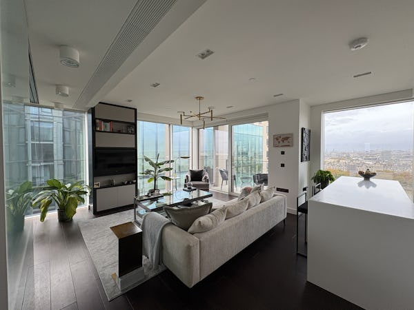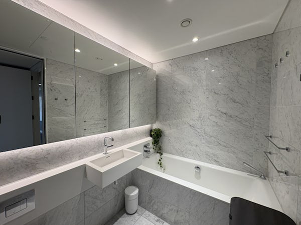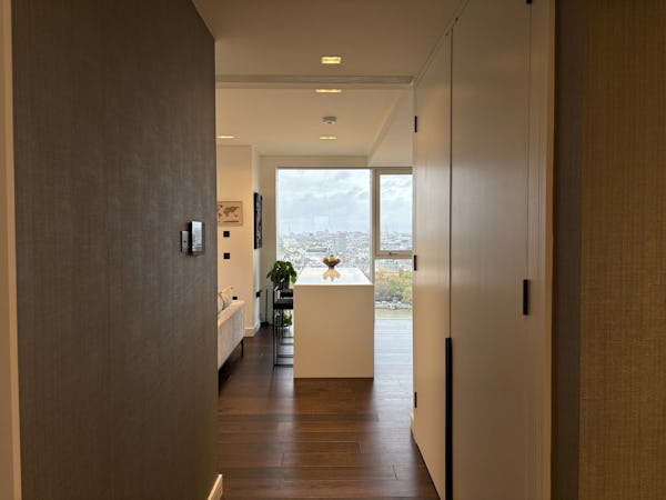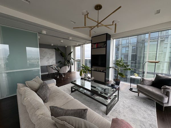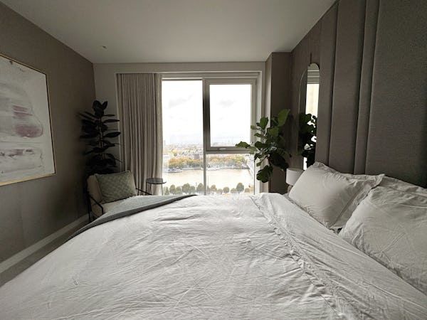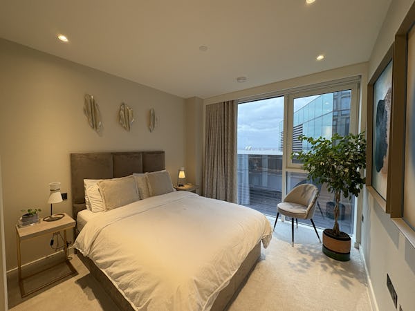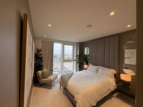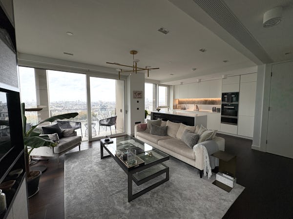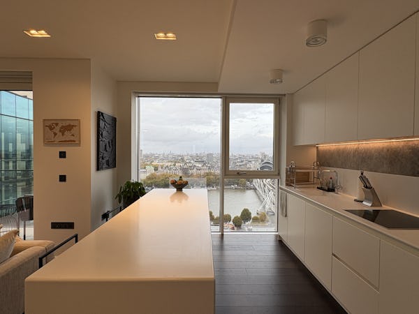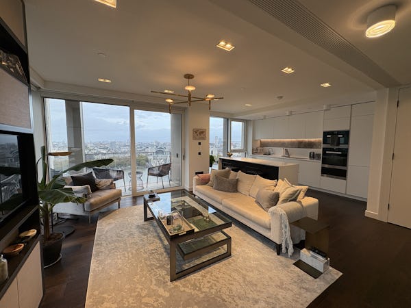 2 bed, 3 bath flat overlooking the London skyline and the Thames. Modern flat with wooden floors, marble bathrooms, kitchen island and a balcony facing the river. Floor to ceiling windows in all rooms.