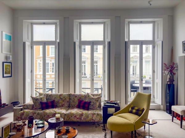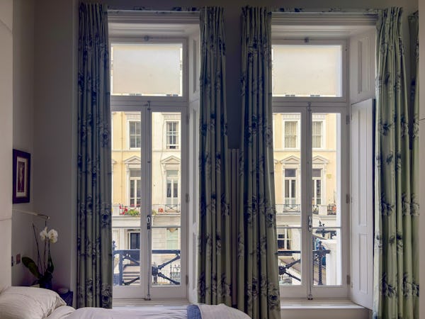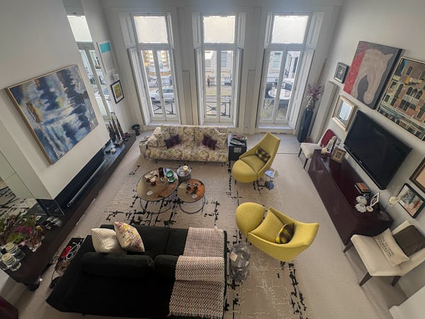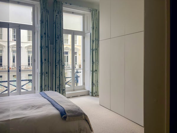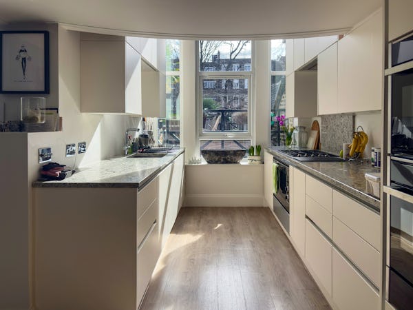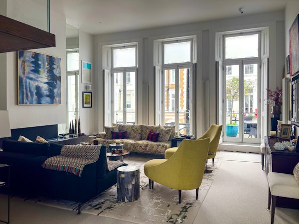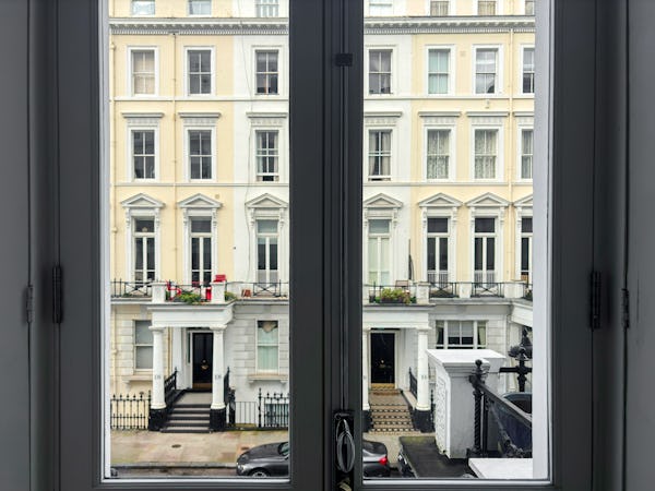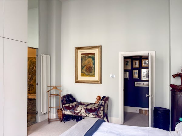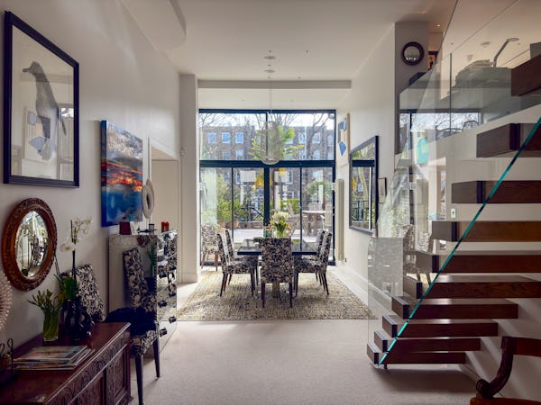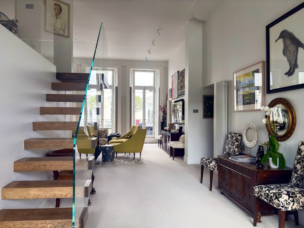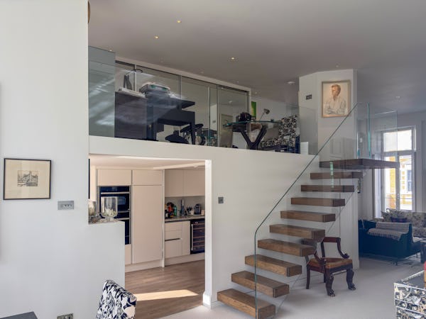This Victorian conversion near Earl’s Court is a sophisticated location that blends classic period character with sharp, modern architectural details. The apartment's primary feature is a set of three floor-to-ceiling French doors in the main reception, which open onto a private balcony and flood the space with natural light. This grand, traditional feel is balanced by a modern floating staircase that leads to a mezzanine, offering a clean contemporary contrast to the original high ceilings.