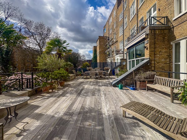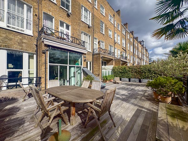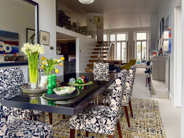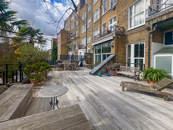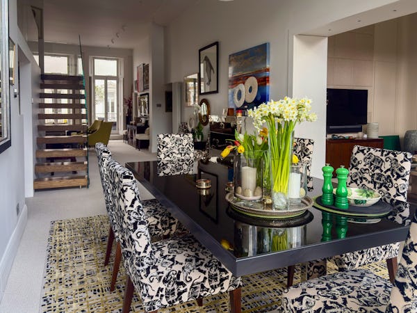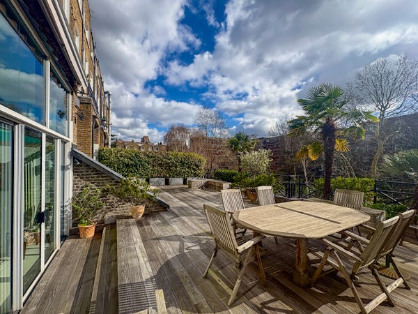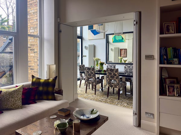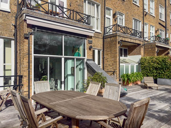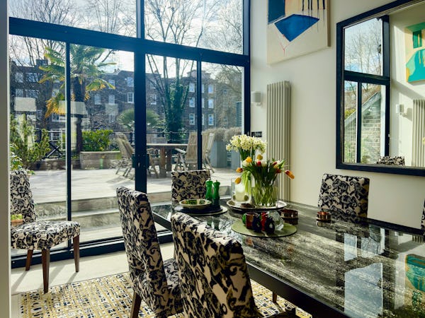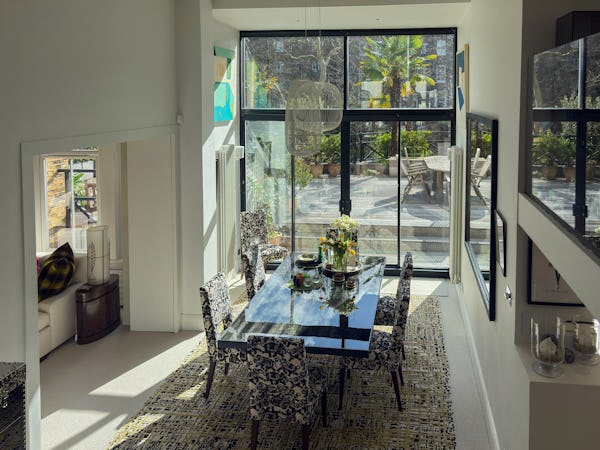 Beyond the main living space, the dining room offers a dramatic secondary backdrop with double-height glass doors and windows opening onto a large private terrace. This combination of classic Victorian proportions and expansive modern glazing makes the flat a highly versatile choice for fashion, editorial, or commercial shoots. The layout provides plenty of depth and variety, allowing for multiple setups within a single, high-spec location.