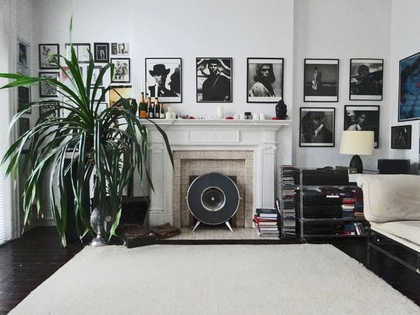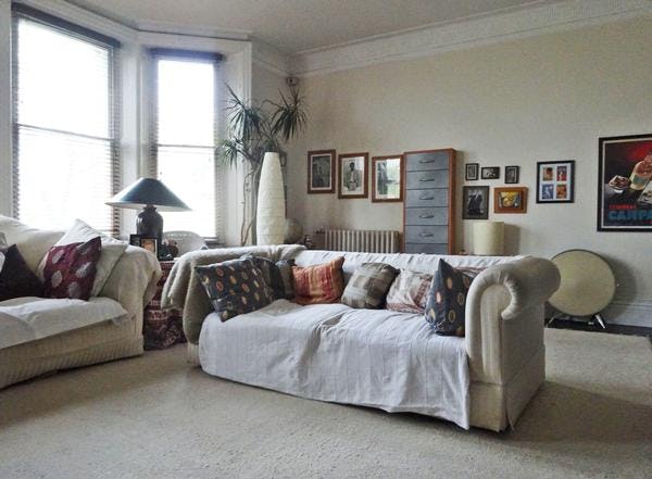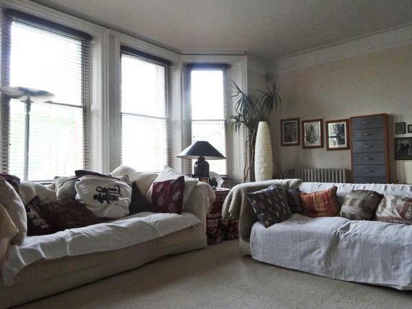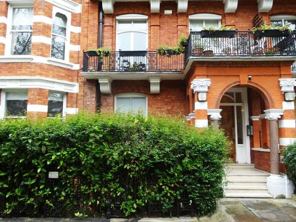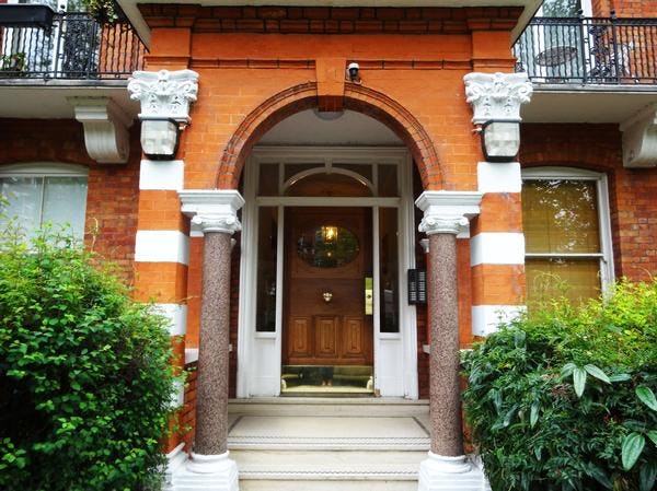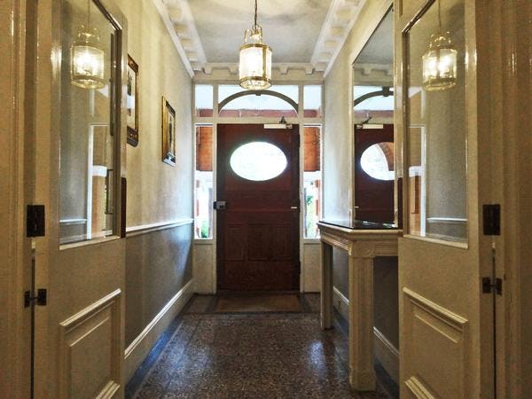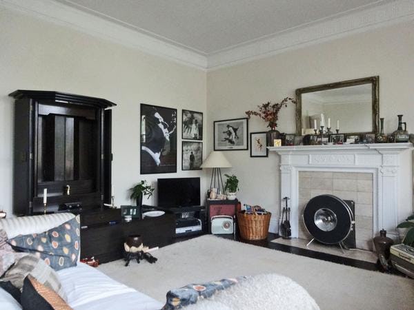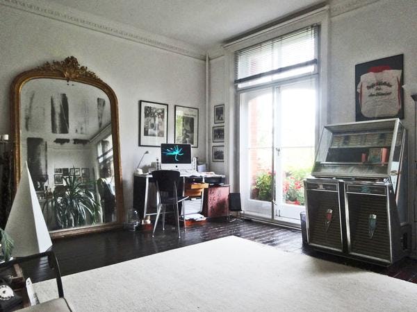 Apartment in traditional mansion block with painted black floorboards and interesting pieces of furniture. Mansion block itself has traditional caged lift and hallway.