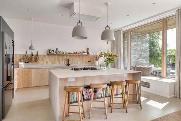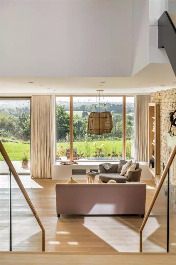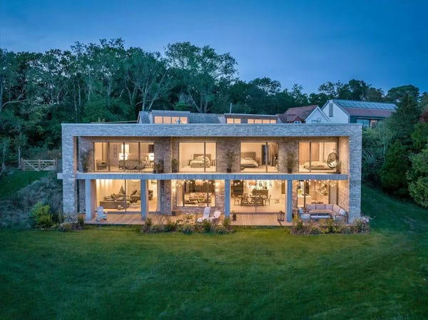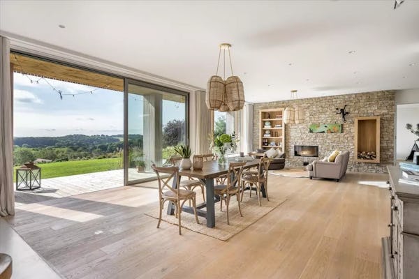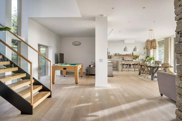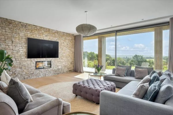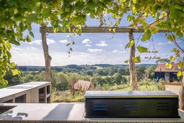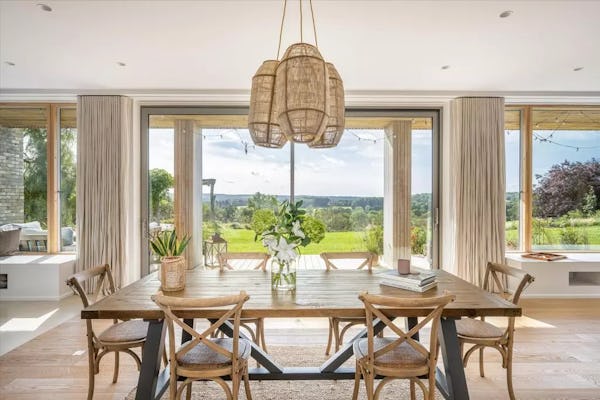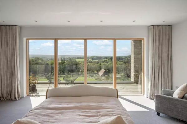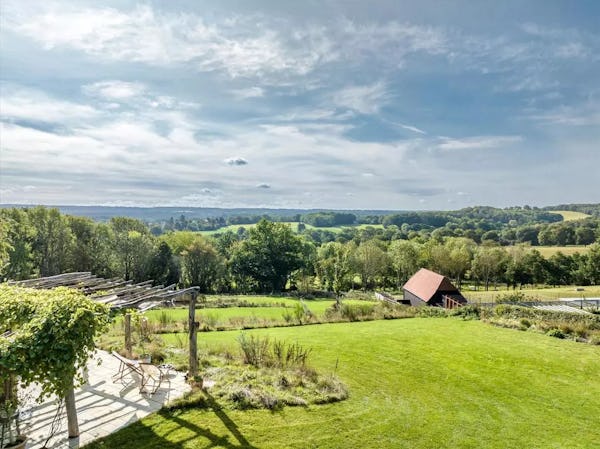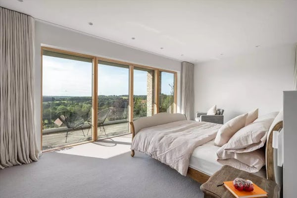 This design-led contemporary house sits on a rare south-facing hillside plot near Frensham, with expansive views across the surrounding countryside. Completed in 2021, the property is light-filled throughout, with a strong architectural focus on outlook and flow. A large open-plan kitchen, dining and family space forms the heart of the house, complemented by a separate drawing room with bar, snug and study. Multiple bedrooms open onto a rear balcony with panoramic views, while the gently sloping gardens, pergola and outdoor kitchen provide an informal, landscaped setting ideal for filming and photography. The property offers excellent access to Farnham, Guildford and major road links, making it a highly practical rural location for production.