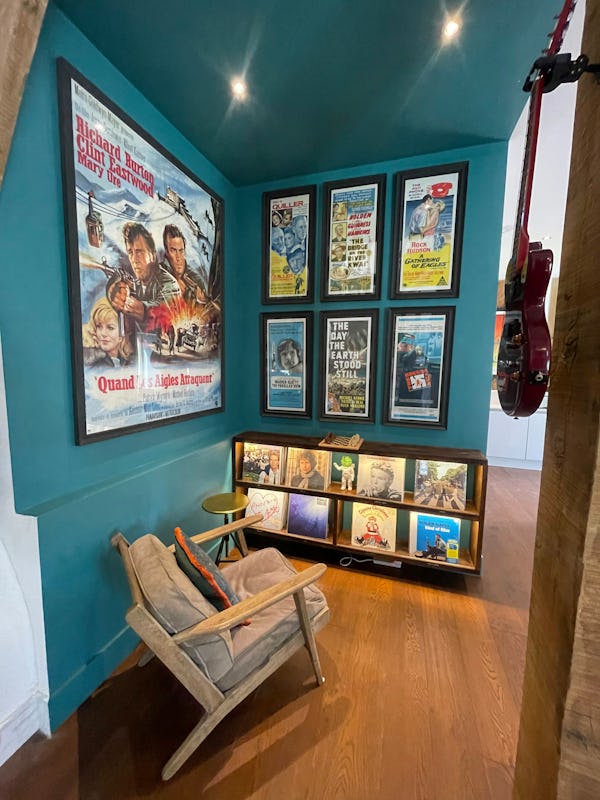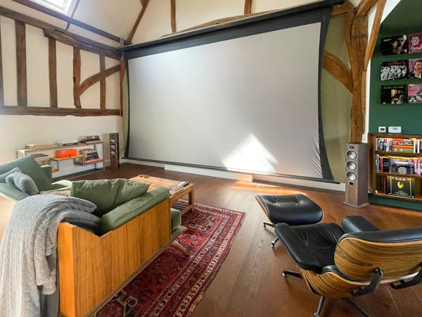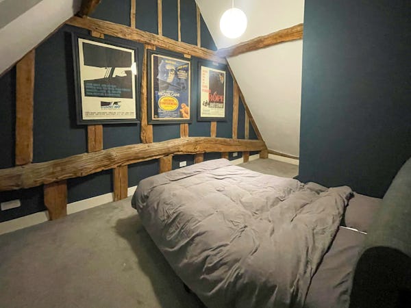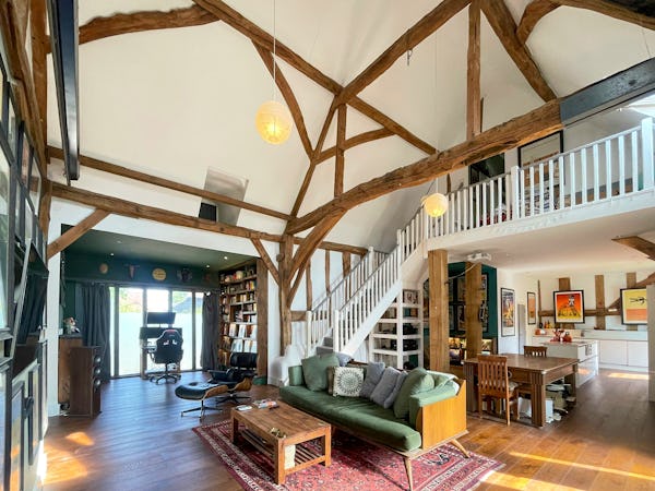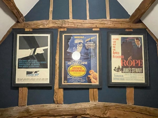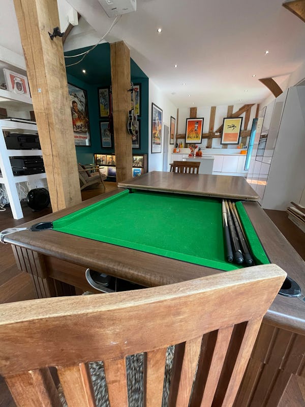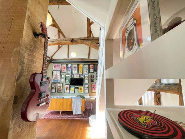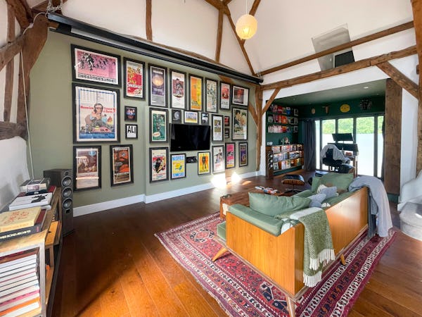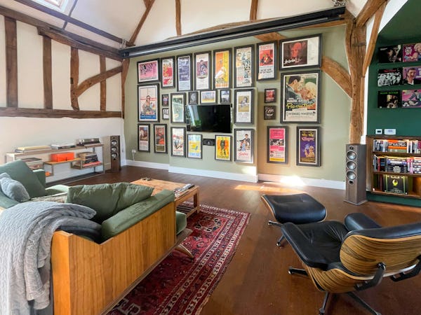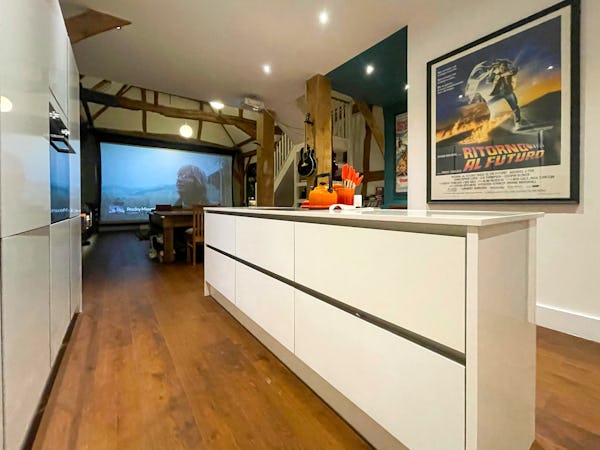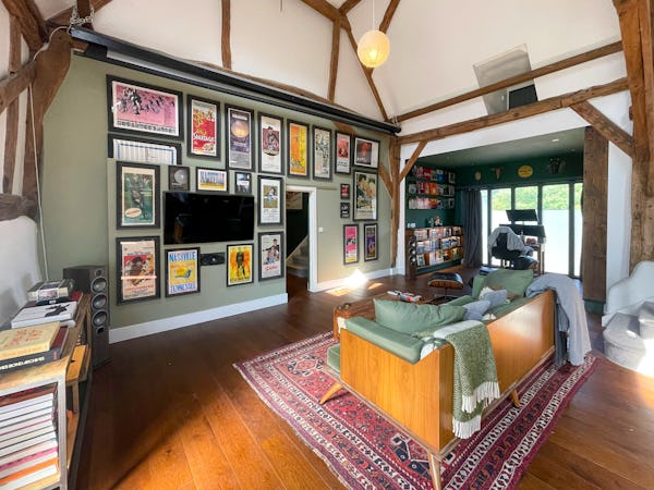 This converted barn features a dramatic 25-foot vaulted ceiling and a large open-plan living space with a contemporary, flexible feel. The interior includes voice-controlled multi-coloured lighting, a 5 metre cinema screen with 7 channel surround sound, a pool table, and a well-stocked media collection with bespoke shelves and vintage film posters. A moveable wall on wheels conceals the television and doubles as a secret door leading to the principal bedroom, offering a distinctive and playful setting well suited to film and television shoots.