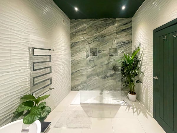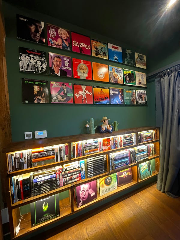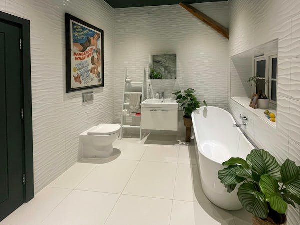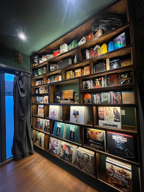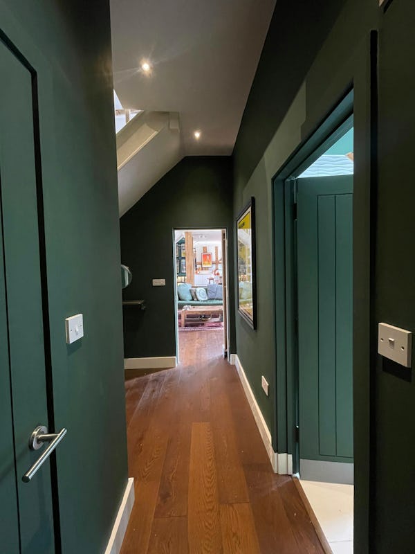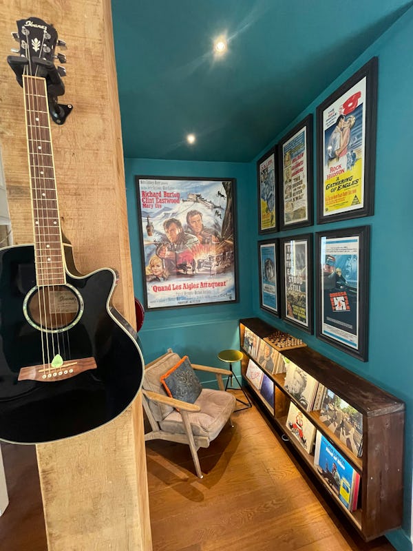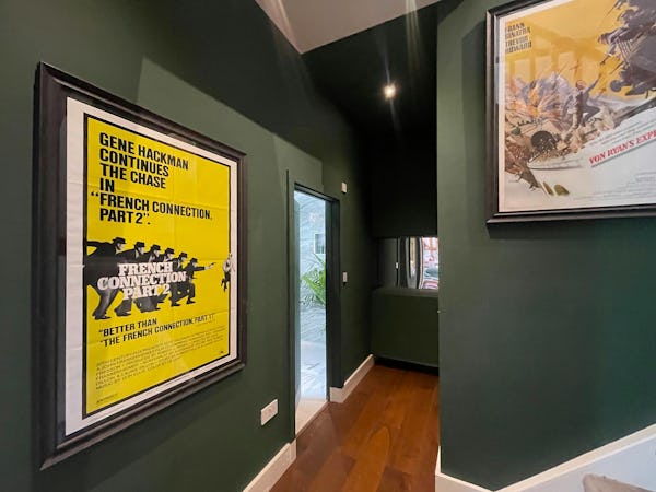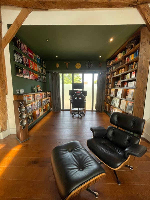 This converted barn features a dramatic 25-foot vaulted ceiling and a large open-plan living space with a contemporary, flexible feel. The interior includes voice-controlled multi-coloured lighting, a 5 metre cinema screen with 7 channel surround sound, a pool table, and a well-stocked media collection with bespoke shelves and vintage film posters. A moveable wall on wheels conceals the television and doubles as a secret door leading to the principal bedroom, offering a distinctive and playful setting well suited to film and television shoots.