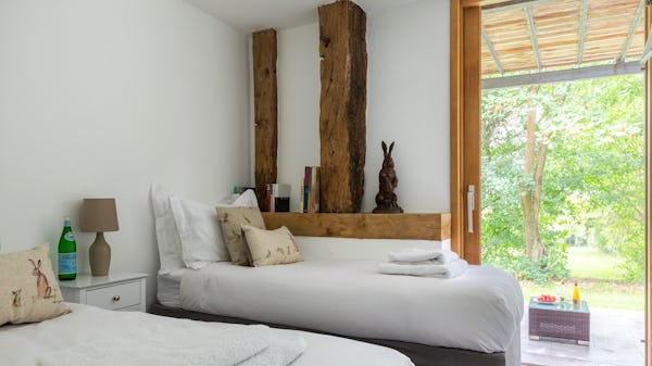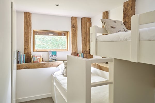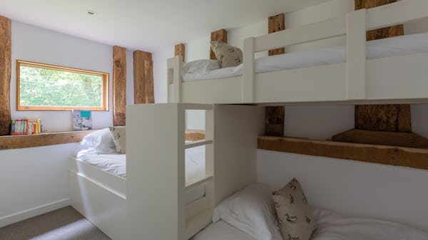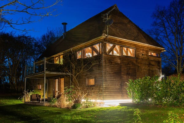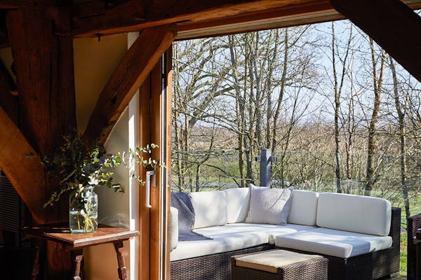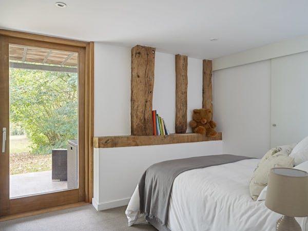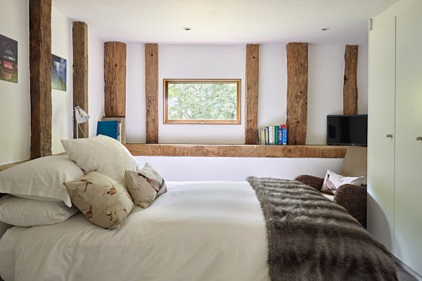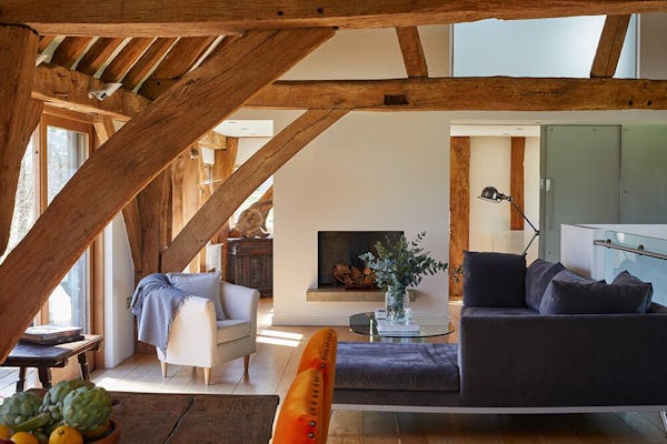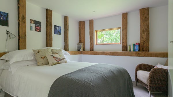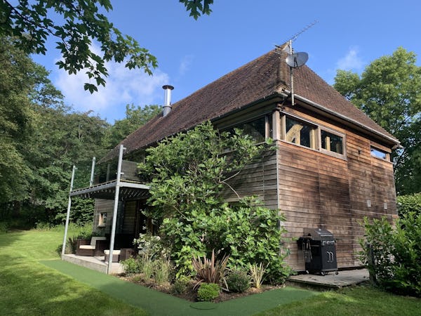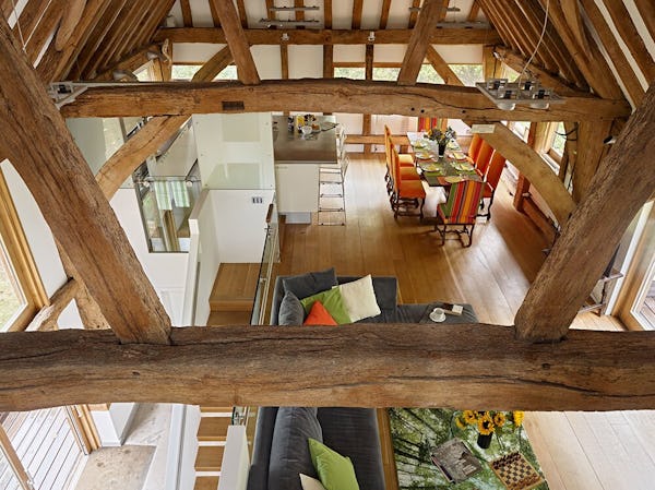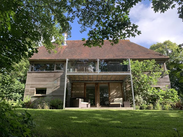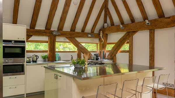 This Sussex barn is a standout location that has clean lines and huge volumes of natural light. The heart of the building is a massive, open-plan first floor where the original oak beams meet high, airy ceilings—ideal for wide shots and easy crew movement. Because of the reverse-level layout, the main living and dining areas sit elevated amongst the trees, opening directly onto a balcony terrace that works beautifully for capturing that "modern country" aesthetic.