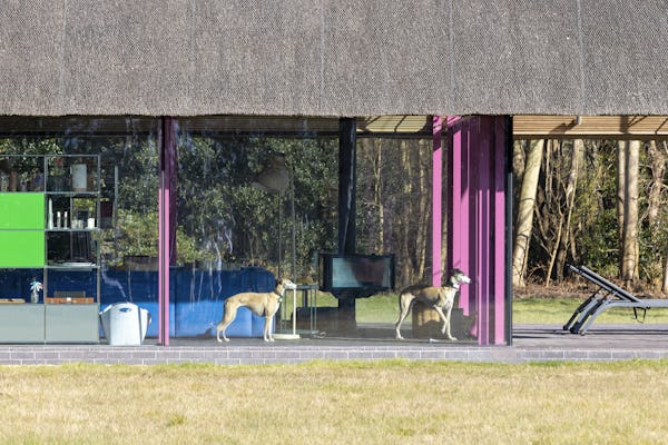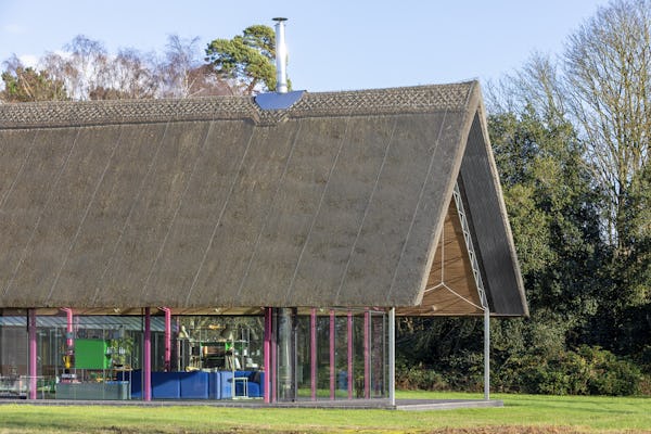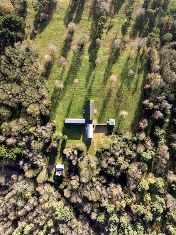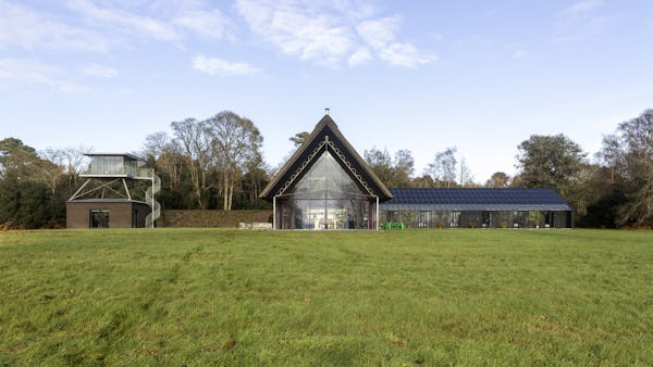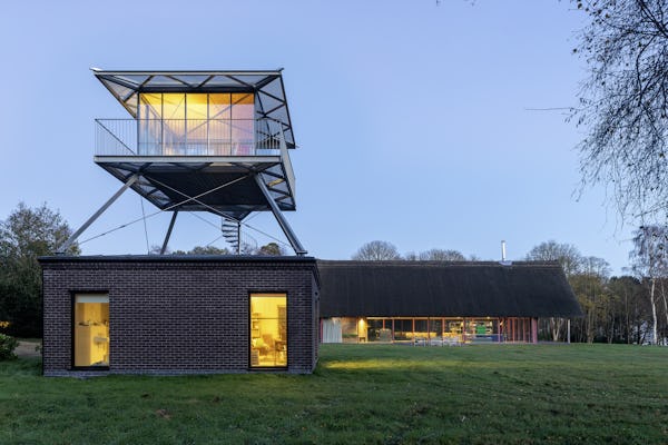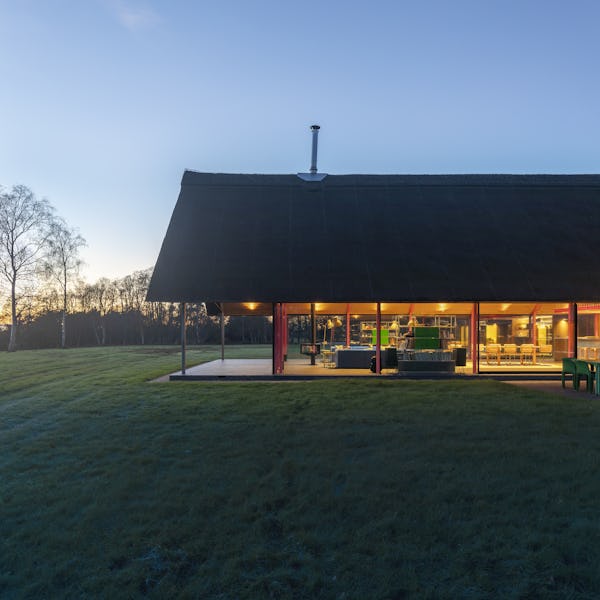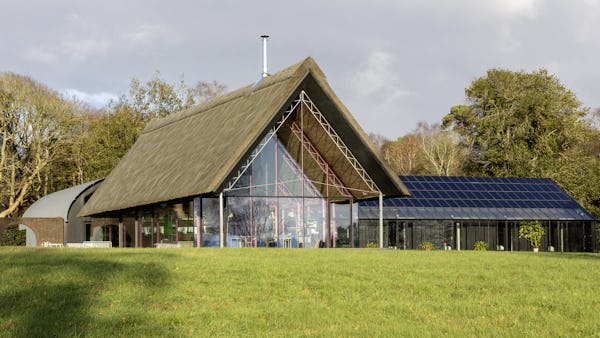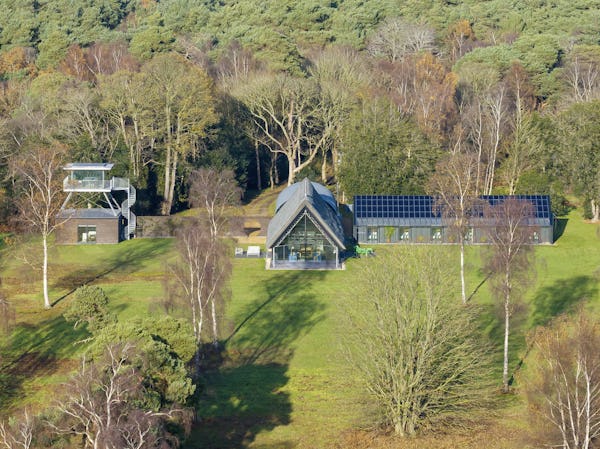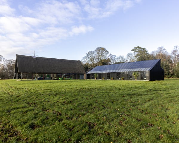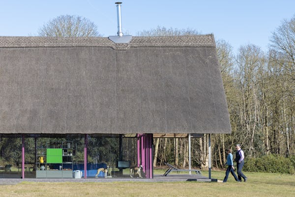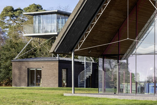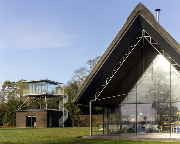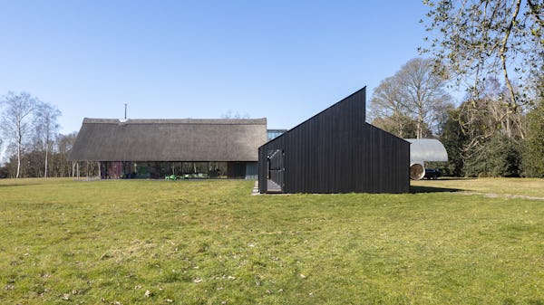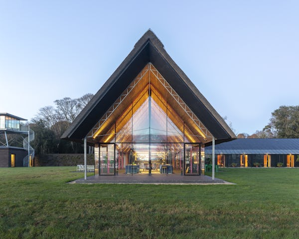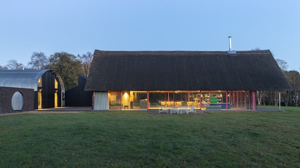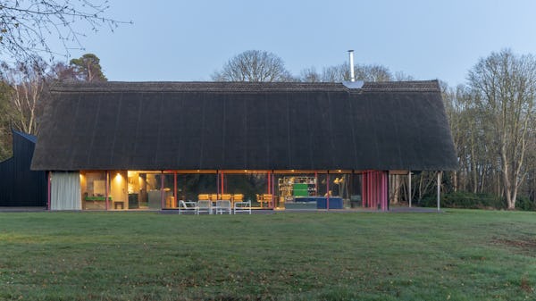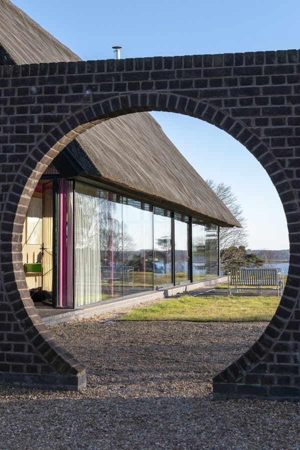 This architect-designed house is composed of a series of distinct buildings, each dedicated to a different aspect of living, set within the Suffolk countryside with beautiful river views. The kitchen, dining and living spaces are housed in a striking pavilion-style structure with glass walls, unexpectedly finished with a traditional thatched roof that reflects the history of its setting. A separate master bedroom building features a lookout tower, while a long, greenhouse-style structure accommodates five additional bedrooms. The arrangement creates a unique sense of space, light and separation, offering multiple visual backdrops within a peaceful rural landscape.