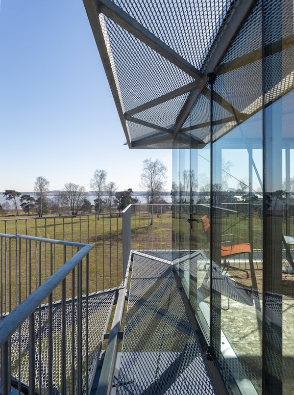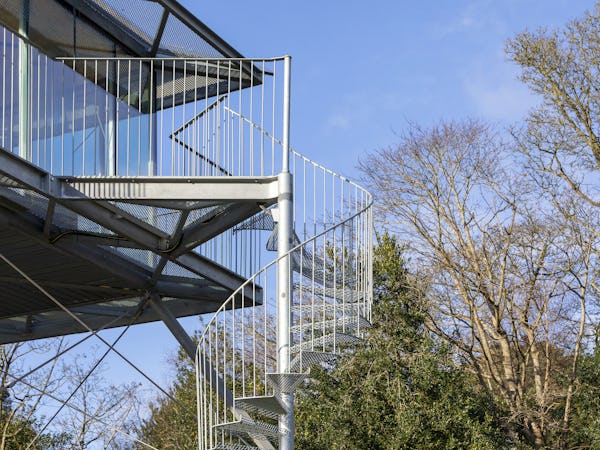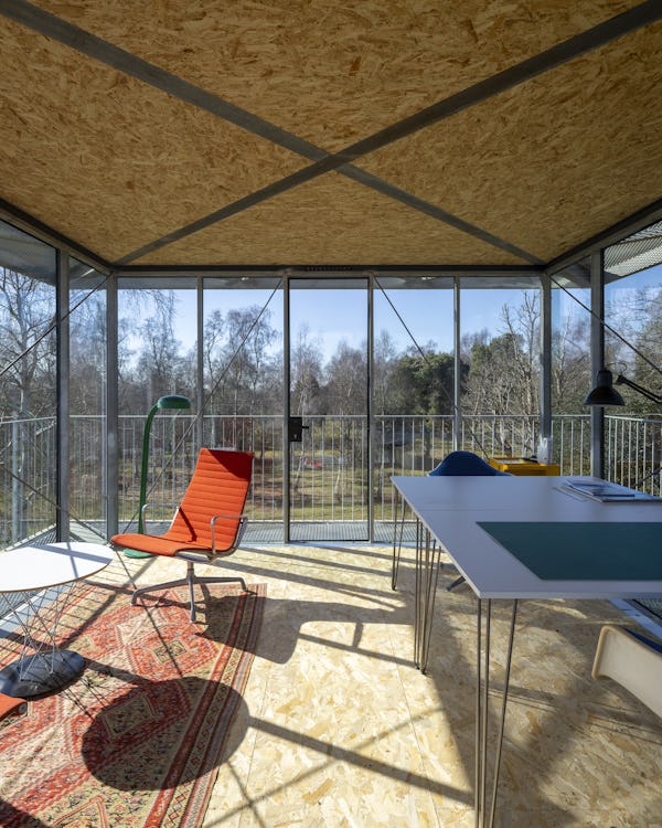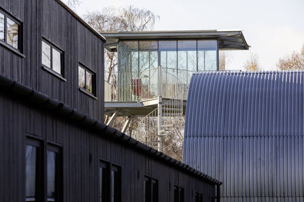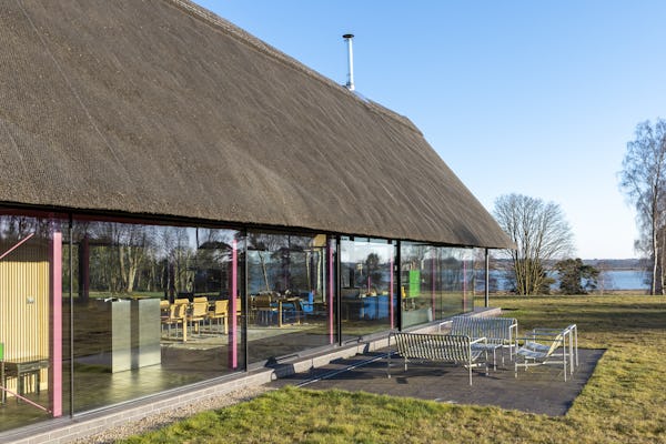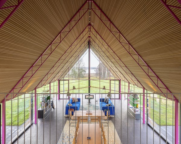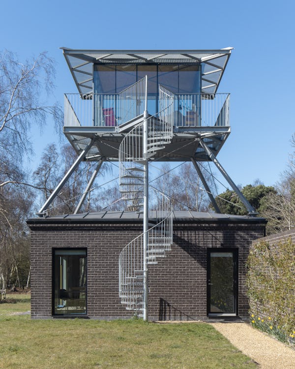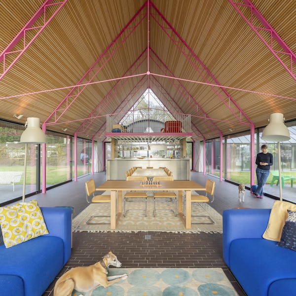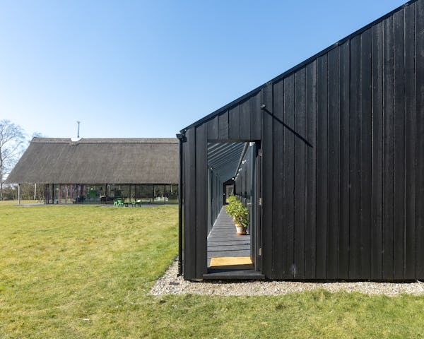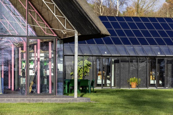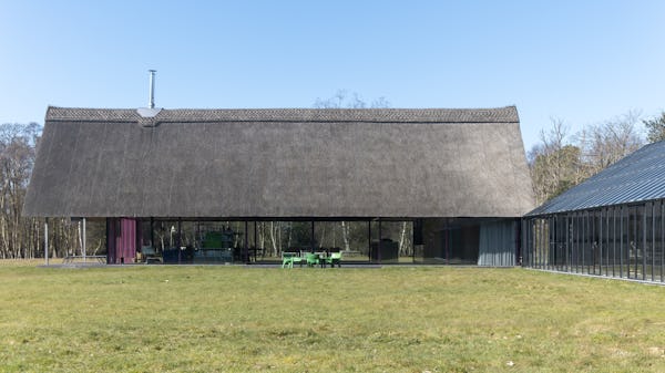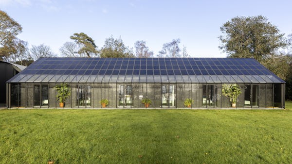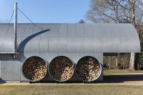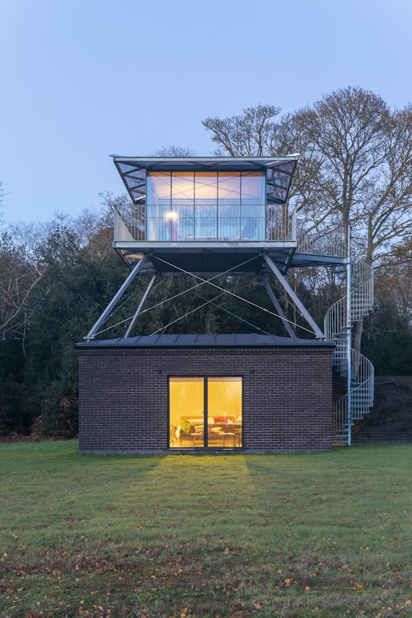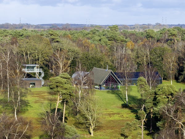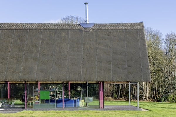 This architect-designed house is composed of a series of distinct buildings, each dedicated to a different aspect of living, set within the Suffolk countryside with beautiful river views. The kitchen, dining and living spaces are housed in a striking pavilion-style structure with glass walls, unexpectedly finished with a traditional thatched roof that reflects the history of its setting. A separate master bedroom building features a lookout tower, while a long, greenhouse-style structure accommodates five additional bedrooms. The arrangement creates a unique sense of space, light and separation, offering multiple visual backdrops within a peaceful rural landscape.