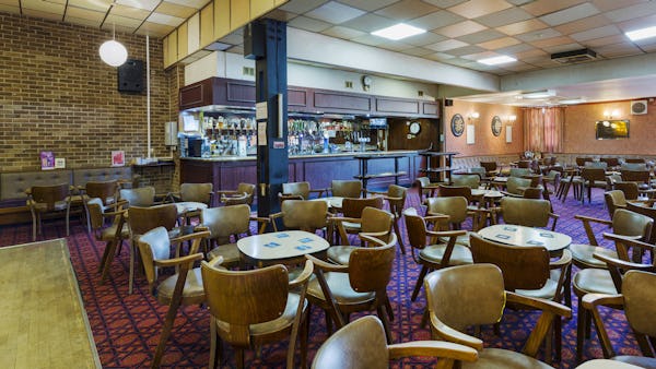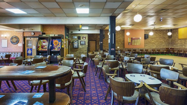 This hall is a members’ club that has been at its current location for 100 years. Established in 1920, the venue features two bars and a meeting room. The interior reflects the style of a 1970s trade union club, with original 1960s tables and chairs, a small stage, the original bar, exposed brickwork, and retro 70s-style wallpaper.