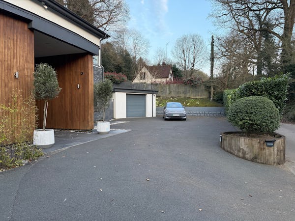 This stunning contemporary home, just 20 minutes outside the M25, offers breathtaking South Downs views and a minimalist design. Built with a low-energy timber and polymer hybrid structure, it features sustainable Western Red Cedar cladding and a zinc-domed roof for year-round efficiency. High-performance argon-filled windows, aluminium frames, and underfloor heating enhance comfort, while smart energy solutions include a smart meter, electric car charging, and a solar energy-sharing system. A sloped garden with landscaped walkways and a glow-in-the-dark driveway complete this eco-conscious, architecturally refined retreat.